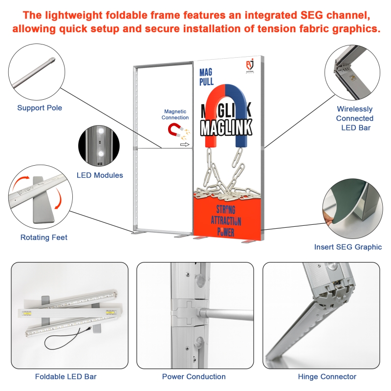 Folding SEG lightboxes are quickly becoming popularity in the advertising world due to their outstanding portability and modular design. These lightweight structures can be conveniently assembled and disassembled, making them advantageous for exhibitions of all sizes. Their modular nature allows for effortless transportation, saving both time and costs.